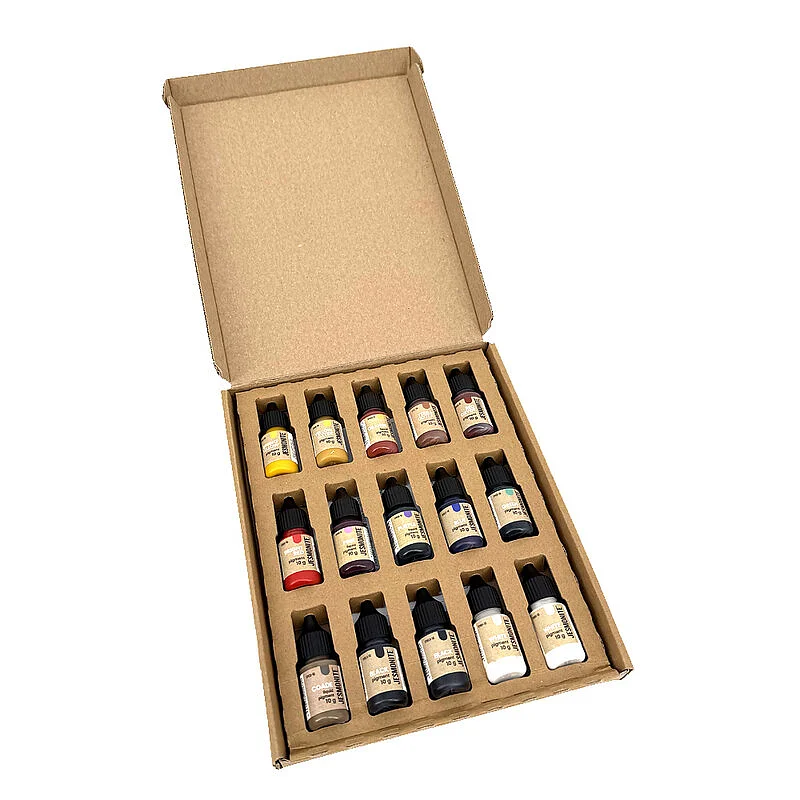 Dieses Set enthält die folgenden 10-Gramm-Farben: 2x weiß, 2x schwarz, 1x gelb oxid, 1x leuchtend gelb, 1x orange, 1x rot oxid, 1x terrakotta, 1x leuchtend rot, 1x grün, 1x blau, 1x coade, 1x lila, 1x rosa.