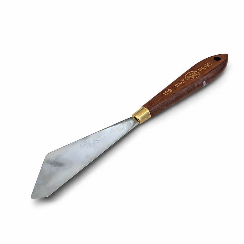 RGM Malspachtel der Plus Linie, Made in Italy, entwickelt für professionelle Qualität und zuverlässige Leistung. Der spezielle elektrolytische Schutz verbessert die Funktionalität der Klinge und die Farbverteilbarkeit, wodurch die Spachtel für jede malerische Anwendung geeignet sind. Die glänzende Oberfläche sorgt für gleichmäßiges Arbeiten, während der dunkelbraune Holzgriff mit Messingzwinge Stabilität und Balance bietet. Die angegebenen Maße beziehen sich ausschließlich auf die Stahlspachtel. Die Spachtel sind einzeln oder als 6er-Set in einem praktischen Kunststoffetui erhältlich.