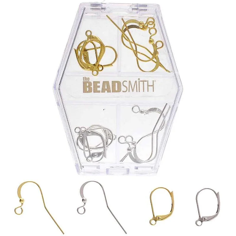 Set mit 16 assortierten Ohrhaken in einer praktischen Kunststoffbox. Enthält Haken- und Klappbrisuren-Modelle in Gold- und Silberoptik, jeweils 4 Stück pro Typ. Ideal für Schmuckhersteller, die Abwechslung und Ordnung in einem Set wünschen.