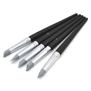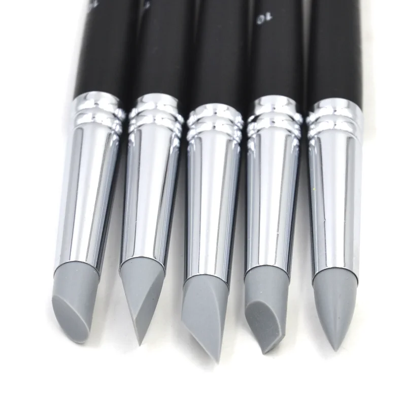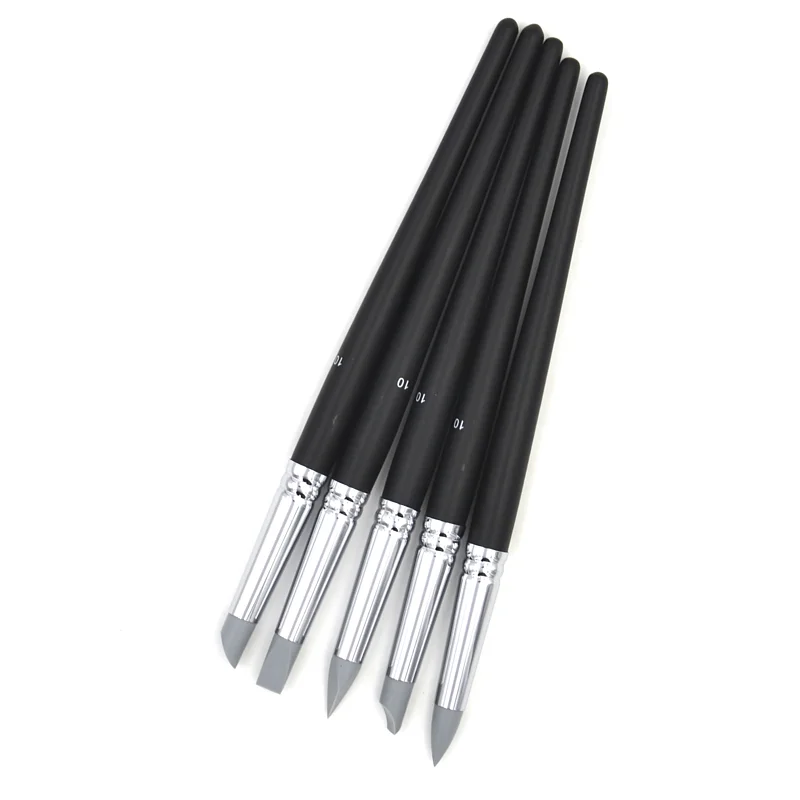 Set aus 5 Pinseln mit Silikonspitze, vielseitige Werkzeuge für Malerei, Zeichnung und Design. Ideal für eine Vielzahl künstlerischer Anwendungen, können sie verwendet werden, um Maskierflüssigkeiten aufzutragen, Farben zu mischen, Graffiti zu erstellen (z. B. Farbe auf Glas, um die ursprüngliche Oberfläche freizulegen), und für das Malen mit schweren Mischungen wie Acrylfarben und Ölfarben. Die flexiblen Spitzen, hergestellt aus einer speziellen Silikonmischung, ermöglichen das präzise Auftragen von Farbe, Formen, Modellieren und Mischen. Perfekt zum Formen von Ton, Plastilin und anderen Modelliermassen. Das Set enthält 5 verschiedene Formen: Kegel, Pfeife, Klaue, Keil und Messer.