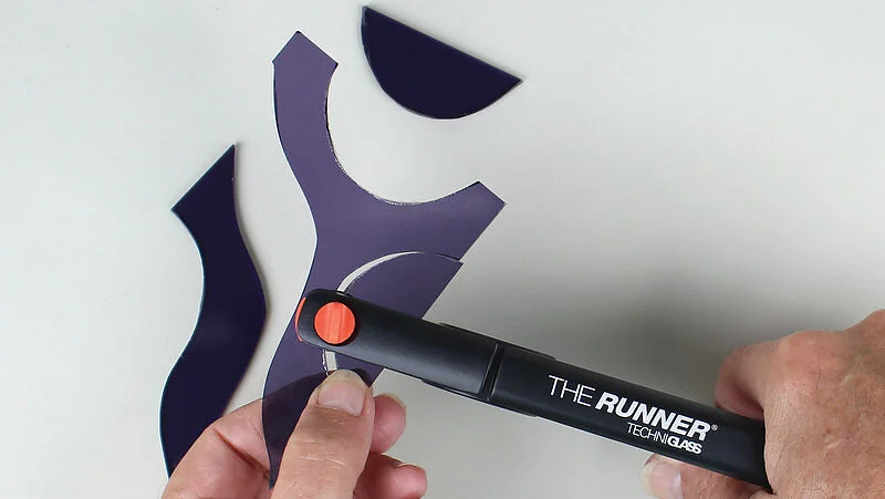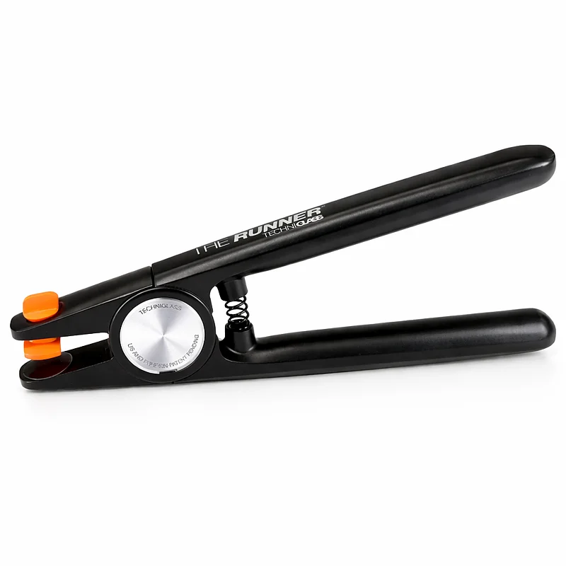 Techniglass The Runner Glass Score Running Tool is a next-generation professional running plier designed to accurately open straight scores, inside arcs, circles, curves, and angled cuts in glass. Made from aluminum alloy, it combines structural rigidity, control, and comfort, allowing precise score running on glass up to 1/4" (6 mm) thick with reduced effort and improved handling.