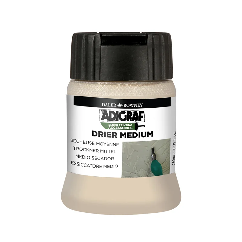 Adigraf Block Printing Drier Medium is formulated to speed up the drying time of water-soluble block printing inks, improving efficiency in the studio. When mixed with Adigraf inks, it can reduce drying time by around half without affecting colour vibrancy or print quality. Ideal for artists working in multiple layers within a single printmaking session.