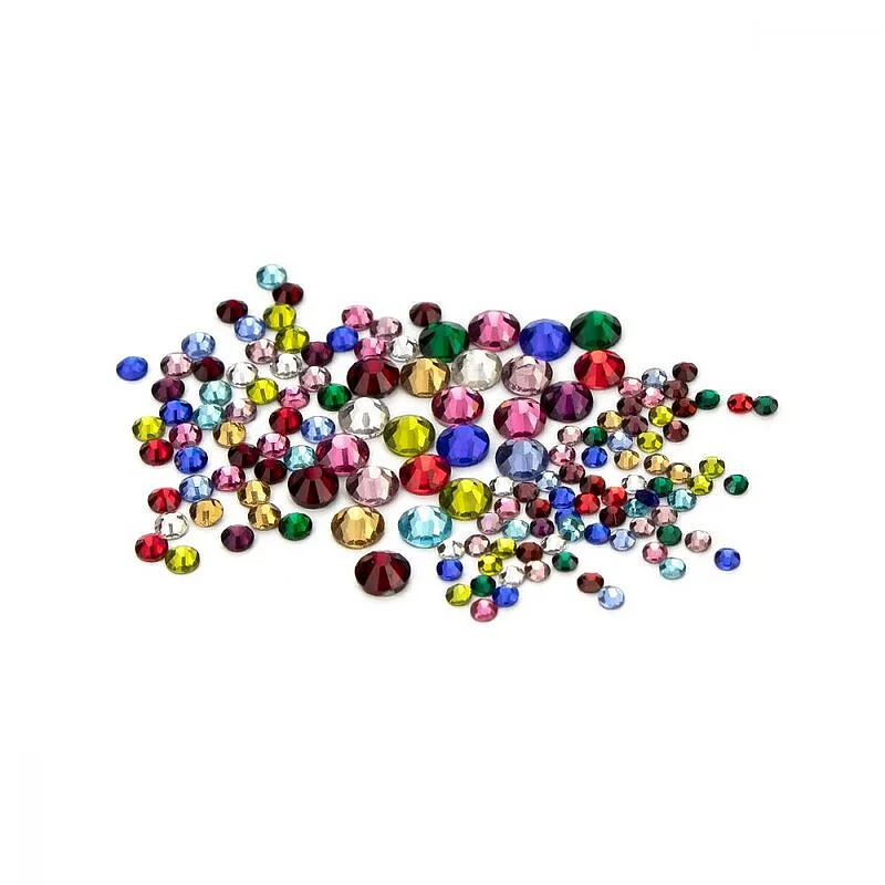 Crystal assortment for bracelets decoration. To set the crystals in soft metal surfaces, use the appropriate punch according to the size of the crystal (Fixing kit art. 47449) The assortment consists of 432 lucky crystals in 12 different colors, 12 for each color and size (1.8 mm - 2.5 mm - 4 mm)