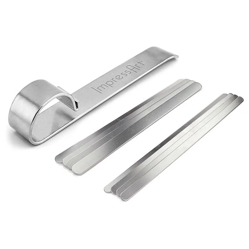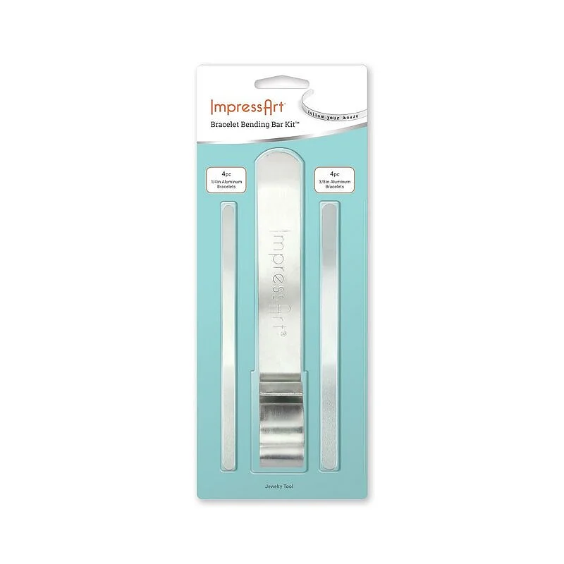 This ImpressArt Bracelet Bending Tool is ideal for creating bracelets. To use this tool simply put the piece of metal in the groove and bend it backwards carefully. This will then create the same shape as the cuff. To make the piece of metal into a bracelet place the piece of metal into the notch and bend around the curved arch, this process then needs to be repeated on the other side to create the bracelet shape. This can be done with ease, it takes a matter of moments and does not require the use of a mallet. This can be used for bending metal strips up to a maximum of 1 1/2" wide (3.81cm). Kit Includes: - ImpressArt Bracelet Bending Bar - 7 x Aluminum Bracelet Blanks, 16 x 150 mm, 2 mm thick