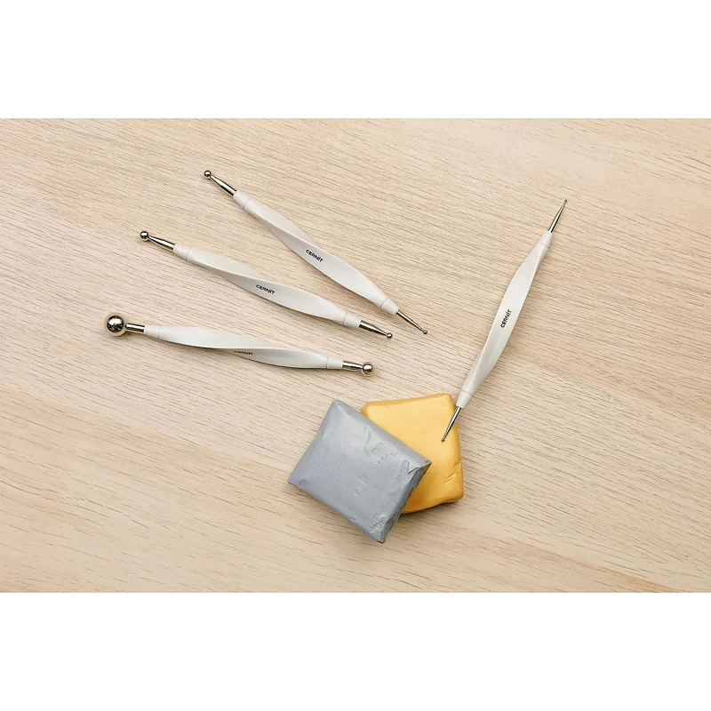 Cernit metal embossing tools are designed for precise shaping and texturing of clay, allowing smoothing, curving and detailed sketching. Suitable for polymer clay, cold porcelain and other types of clay, they feature an ergonomic handle that ensures comfortable and controlled use. Each tool has two ends with balls of different diameters to expand creative possibilities.