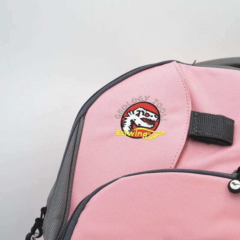 Children’s geologist backpack in pink with Estwing Geological Tools logo. Made of durable fabric, it’s ideal for field trips and geology adventures, combining comfort, functionality and style for young explorers.