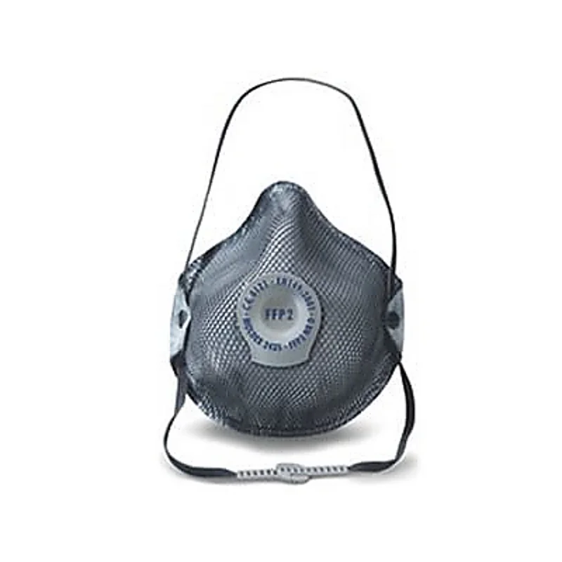 Mascherina con valvola filtro carboni. • Limiti d'impego: polveri tossiche, fumi e nebbie/aerosol a base acquosa e oleosa fino a 12 x TLV, vapori organici e acidi inferiori al TLV, odori sgradevoli. • Principali campi di utilizzo: ossido di alluminio, polvere di freni, polvere di mattoni, ossido di calcio, cemento, polvere di porcellana, di carbone, di calcestruzzo, di cotone, di gesso, di fieno, polvere e fumo di piombo, fumo di saldatura, intonaco, polline, zucchero, biossido di zolfo, alcol per pulizie, solventi per vernici. • Con valvola di espirazione VENTEX®, morbida flangia nasale interna, elastico con chiusura a clip • STRATO DI CARBONI ATTIVI