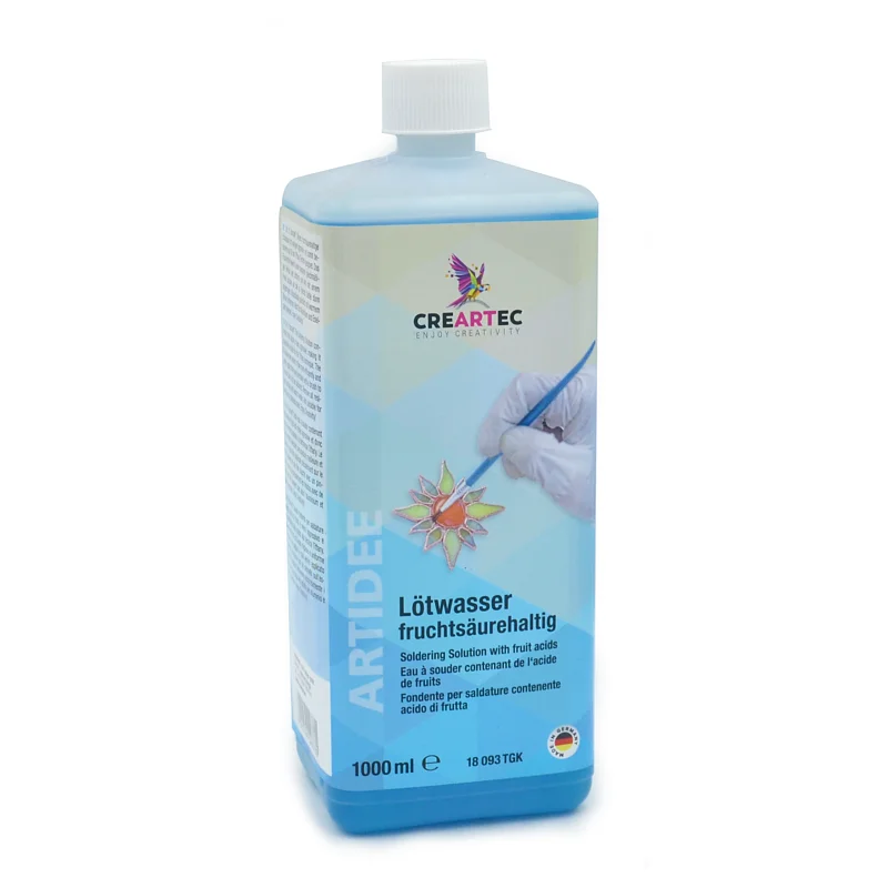 This liquid flux contains malic acid (or fructic acid, derived from apple) and is therefore less aggressive but still perfect for Tiffany technique creations.