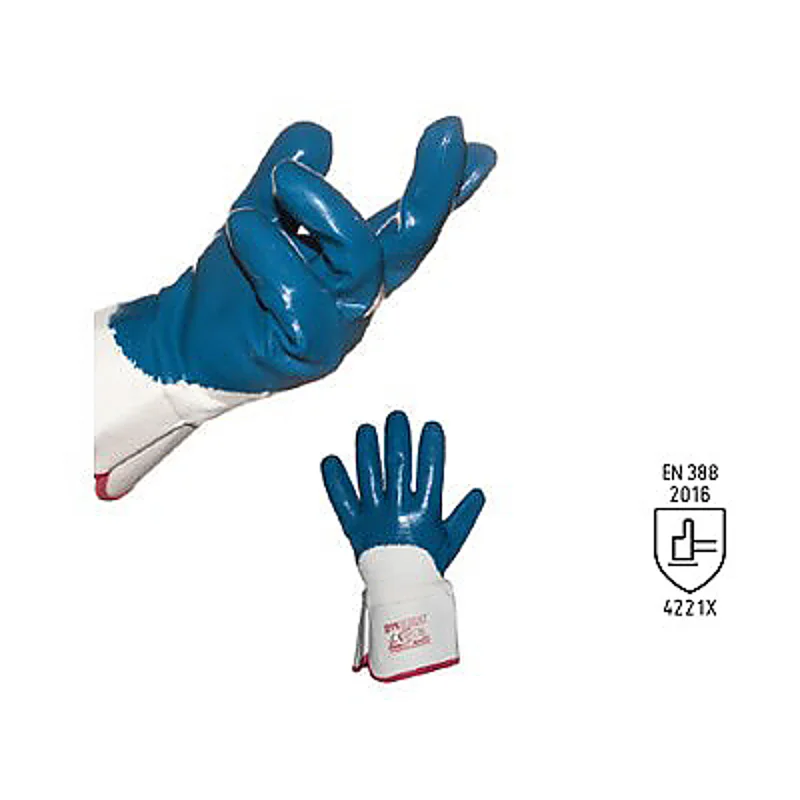 Guanto in nitrile pesante, interno in cotone, dorso aerato e manichetta di sicurezza.