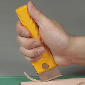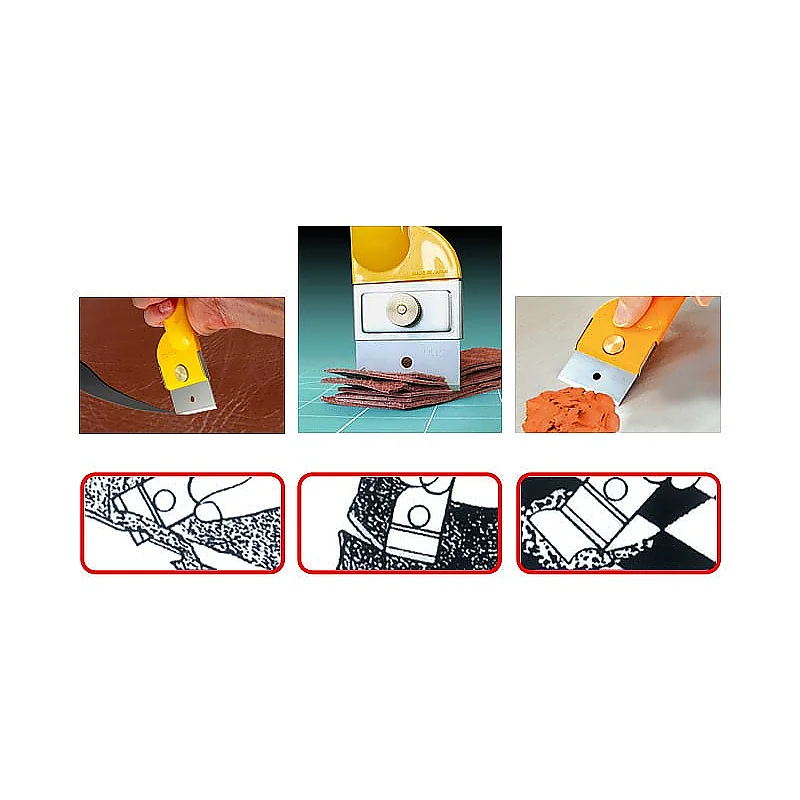 This outstanding knife is excellent for draw cutting, skiving, or punching straight lines in almost any kind of leather. This indispensable leather tool comes with a double edge blade to last twice as long, just remove the metal safety sheath (comes standard with knife), unscrew the bolt, remove the bolster, remove the blade and flip it around before reassembling. This blade is made of high quality steel and is quite easily sharpened on a sharpening stone. But unlike fixed blade skiving knives, replacement blades are available. To cut leather simply place your leather onto a quality purpose made cutting mat, then insert the appropriate corner of the blade into your leather and pull the knife towards you, twisting the blade in the direction you wish to cut. Please ensure your blade is cutting the mat as well as your leather to ensure control and reduce the risk of slippage. When turning the knife around corners while cutting, pitch the handle of the knife away from you for more control, and when cutting in straight lines pitch the handle of the blade towards you for straighter lines and more efficient cutting. For skiving place your leather flesh side up with the edge you wish to skive facing away from you on a hard surface the blade cannot cut, such as glass. Holding the knife with the bevel facing upwards and the edge of the blade facing in the same direction of the edge of the leather, or at a slight angle as preferred, cut your leather outwards or across from where you would like the skive to begin straight through to the edge of the leather. Made from high impact plastic, the handle can withstand the impact of a wooden mallet quite well.