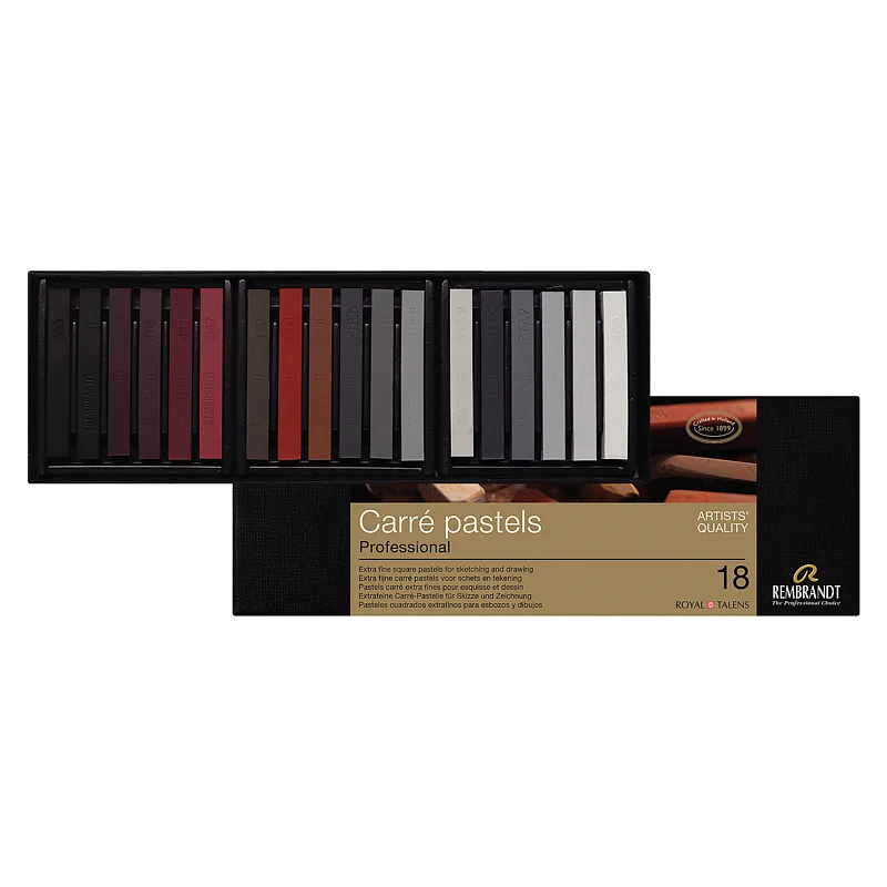A centuries-old tradition of using natural materials such as chalk, china clay, and colored earth is honored by Rembrandt carré pastels. The carré pastels are an exclusive range of eighteen traditional colors, namely earth tones, greys, white, and black. The raw materials are the same as those for Rembrandt soft pastels but applied in a different ratio. This makes carré pastels less soft and ideal for sketching.