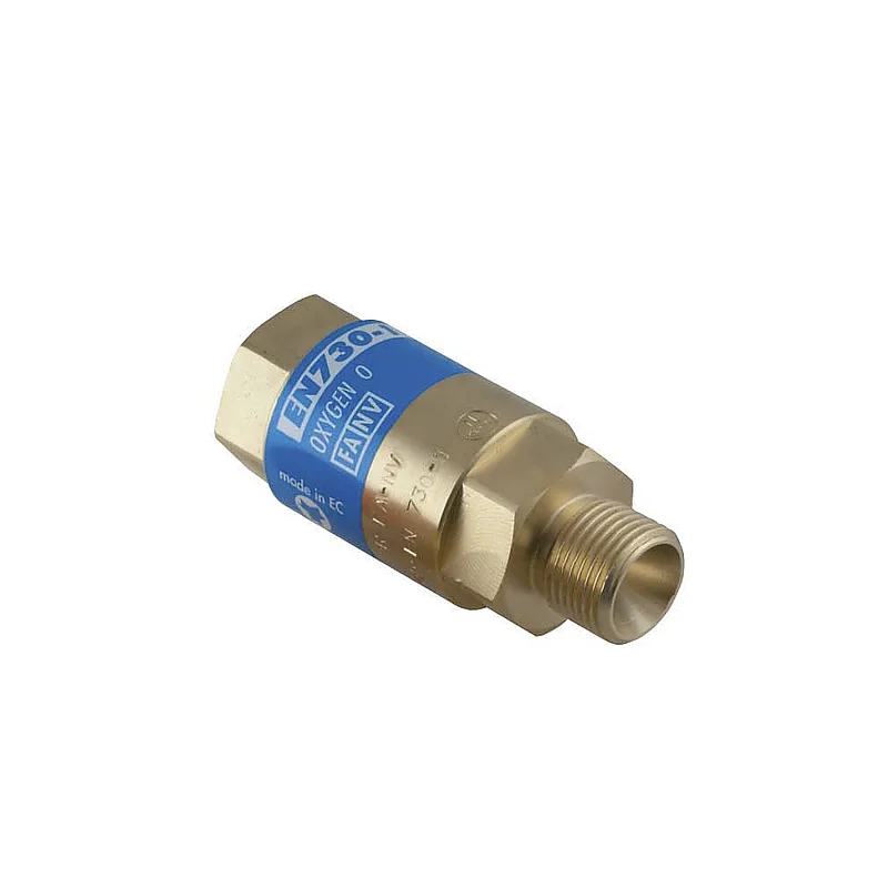 2-Function Safety Valve for Oxygen Pressure Regulator, providing protection against flashback and gas return. To be installed at the outlet of the pressure regulator, ensuring maximum safety when using oxygen. Maximum flow rate: 30 m³/h. Right-hand 3/8" connection. Made from high-quality materials for maximum reliability.