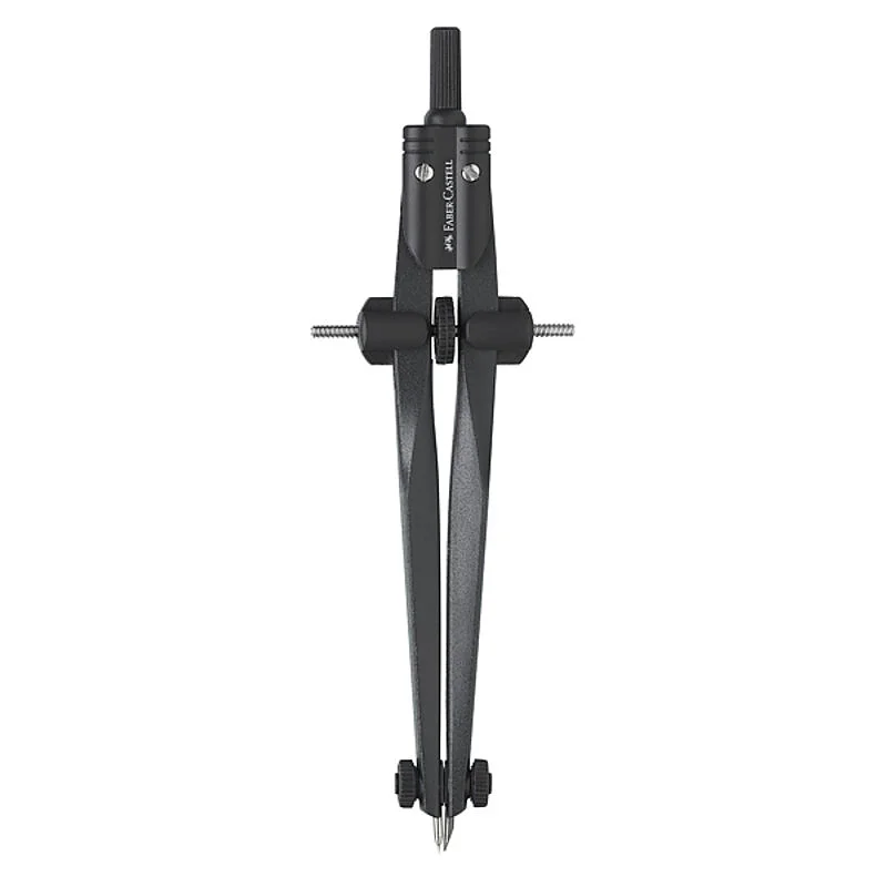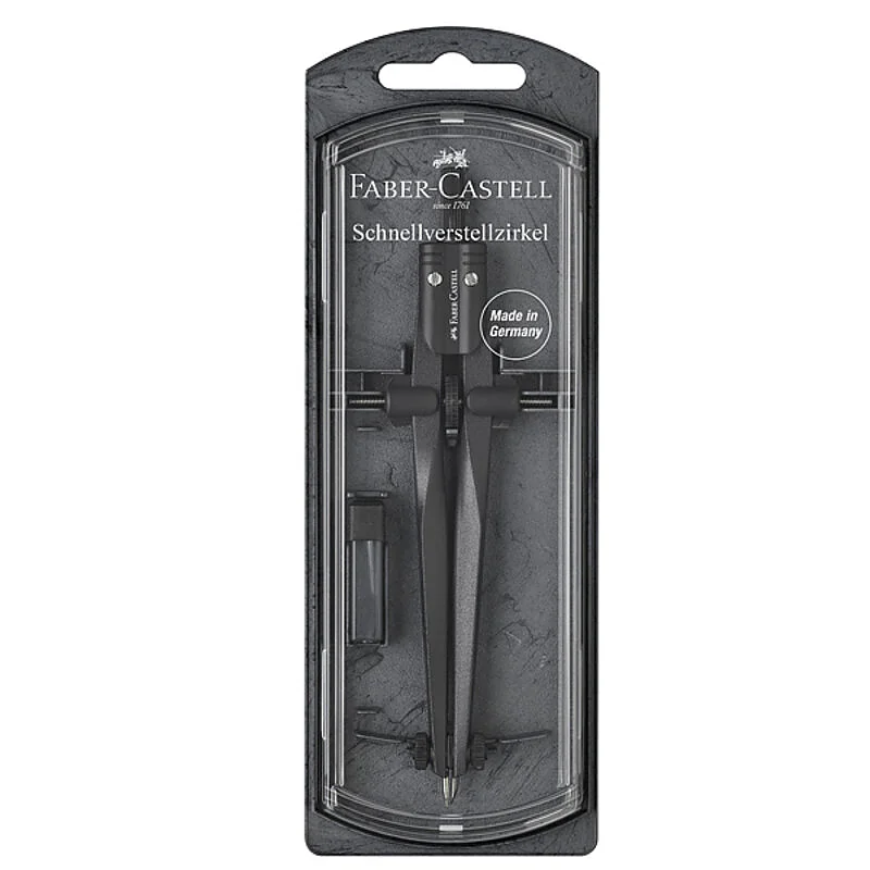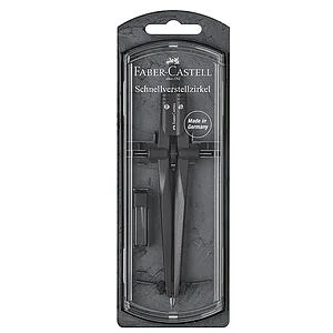 Faber-Castell Stream 174530 quick adjustment bow compass, featuring a modern and ergonomic design for easy leg opening and smooth handling. Made of sturdy metal, it allows circles up to 340 mm in diameter with precision and comfort. Supplied with spare parts and leads, it is the ideal tool for students and professionals in technical drawing.
