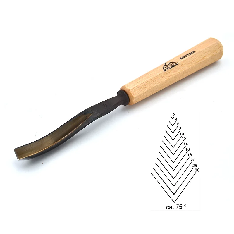 La casa austriaca STUBAI è produttrice di utensili per la scultura del legno realizzati con acciaio 58-60 HRC, di grande qualità e durata. Le sgorbie sono fornite con una lama già affilata e pronta all'uso, non lucidate. La lunghezza della lama varia a seconda del tagliente, più largo sarà il tagliente e più lunga sarà la lama.