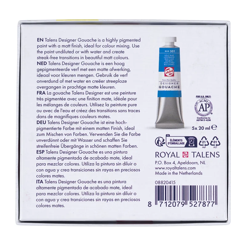 Set of 5 extra fine gouache paints in convenient ready-to-use aluminum tubes.
