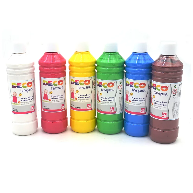 Set 6 flaconi da 500 ml di colore a tempera a base acqua, completamente atossico. Facilmente miscelabile per ottenere un'ampia gamma di tonalità.