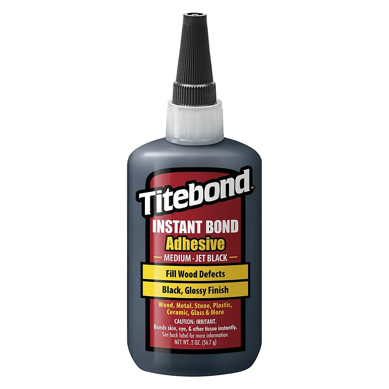 Titebond Instant Bond Medium Jet Black is a medium-viscosity cyanoacrylate (CA) adhesive that dries to a glossy black finish. Perfect for accenting details, inlays, working with spalted wood, and filling knots or cracks, it combines strength with versatility. Bonds are stronger than wood and resistant to heat, impact and solvents. Also suitable for rubber, plastics, ceramics, metals, stone and other porous materials.