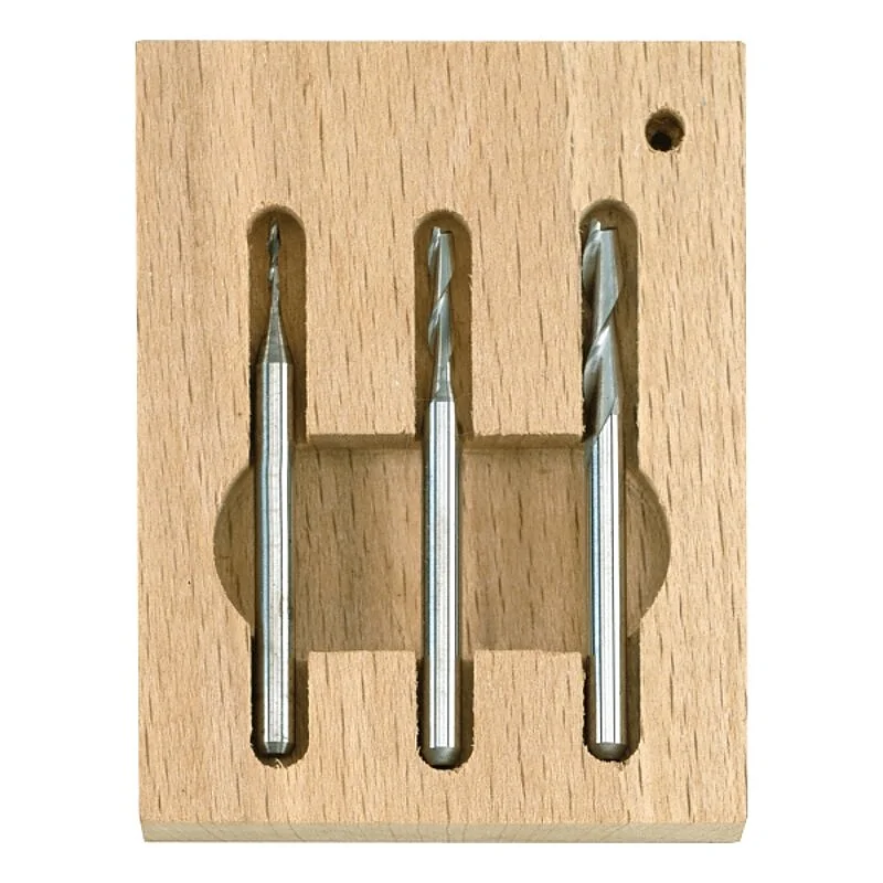 These double flute cutters are made of solid tungsten, clockwise cutting. The fishtail profile ensures cutting to the centre, allowing boring too. Usable on cast iron, hardened cast iron, steel, cast steel, brass, aluminium, and even glass, plastics and carbon fibre. One each of shaft diameter 1.0 - 2.0 and 3.0 mm.