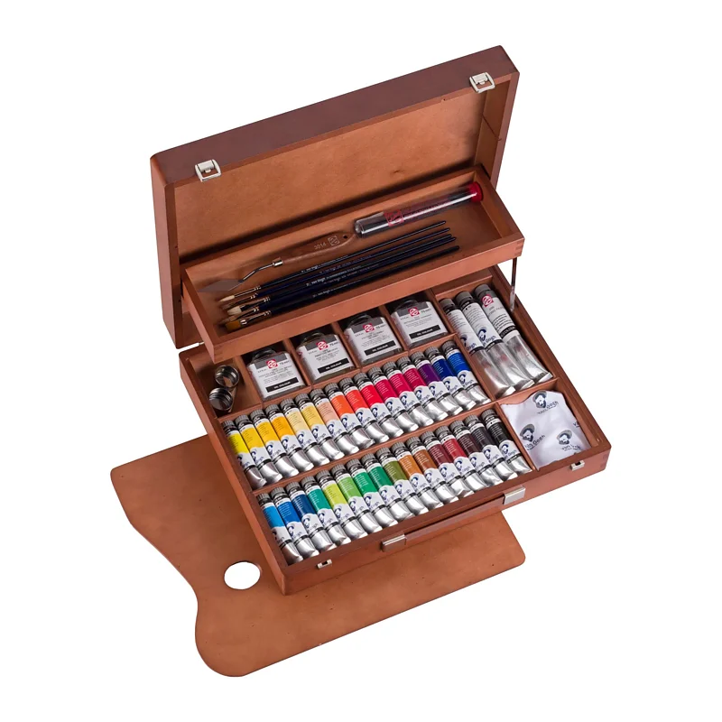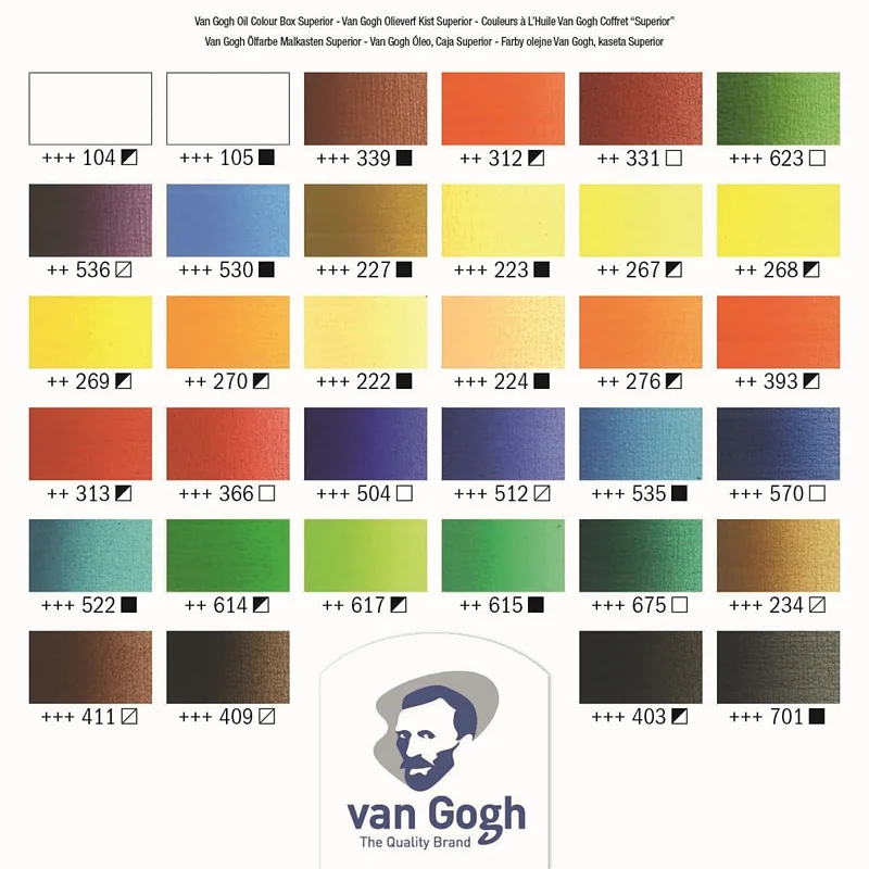 When looking for a better oil colour, this Dutch-crafted Van Gogh range is for you. A buttery oil that features excellent tinting strength, a high level of pigmentation for intense colours, a uniform degree of gloss and thickness amongst colours, and good to excellent lightfastness ratings. Easy to mix and use. These oils are great for beginners, students in advanced studies, and working artists. This general colour selection superior box set includes: