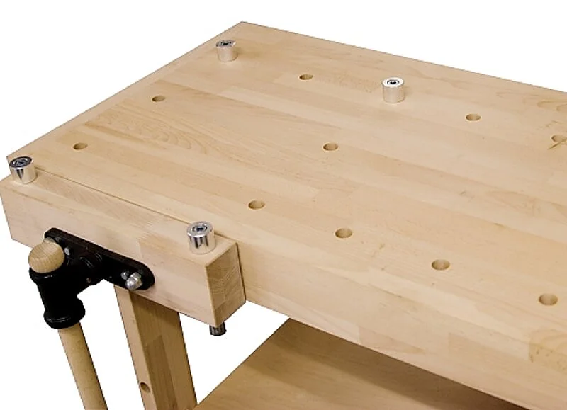 Banco da lavoro modello HB 1901 di fabbricazione precisa e accurata, completamente realizzato in massello di faggio. Legno lamellare di faggio con giunture a spina, con mensola e 4 fermi in legno, con doppia fila di fori per fermi. Superficie non trattata. Viene fornito non montato. Dotazione di serie: 4 fermi rotondi.