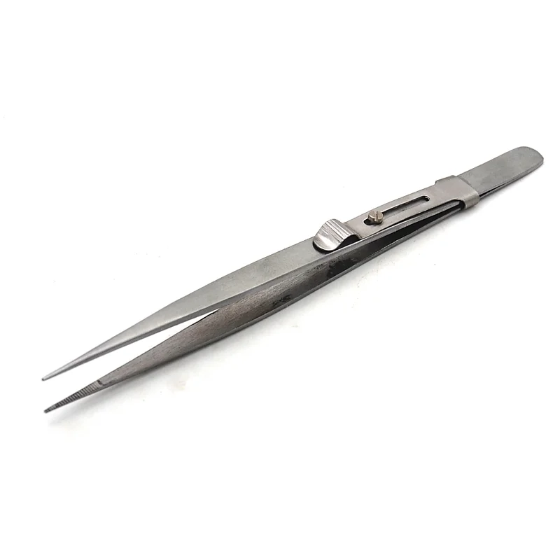 Estas pinzas de punta fina son la solución ideal para sujetar con firmeza piedras y componentes pequeños. Las puntas están estriadas para garantizar un agarre duradero de las piedras. El mecanismo de bloqueo funciona con precisión eliminando la tensión de la mano. Acabado en acero satinado.