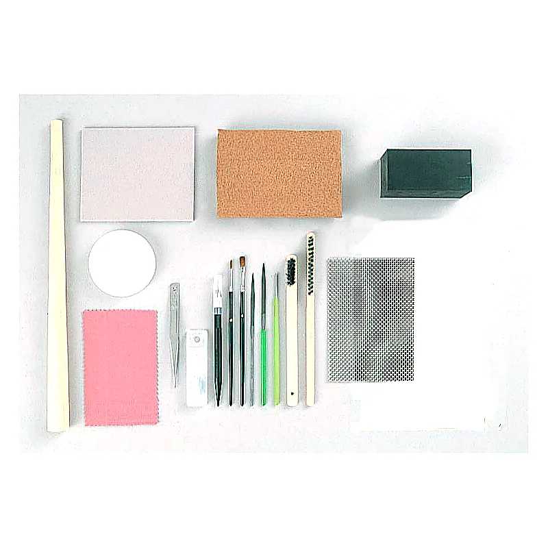 Art Clay Tool Kit 1-4. Contiene: 1 mandril de madera (#9092), 1 trapo para limpiar plata (#9096), 1 esponja abrasiva 320-600 (#9603), 1 bandeja de plstico (#10281), 1 Cutter + hojillas de repuesto (#9099), 1 pasta de corcho 230 gr. (#9103), 1 pinza, 1 pincel #0, 1 pincel #4, 1 lima 170x5mm., 1 lima 160x4mm., 1 bruidor (#9101), 1 cepillo de acero de cerdas largas (#9108), 1 cepillo de acero de cerdas cortas (#9097), 1 cubo de goma negro 100x50x50 mm. (#9107), 1 rejilla de coccin acero inoxidable 15x10,5 cm. (#9100).
