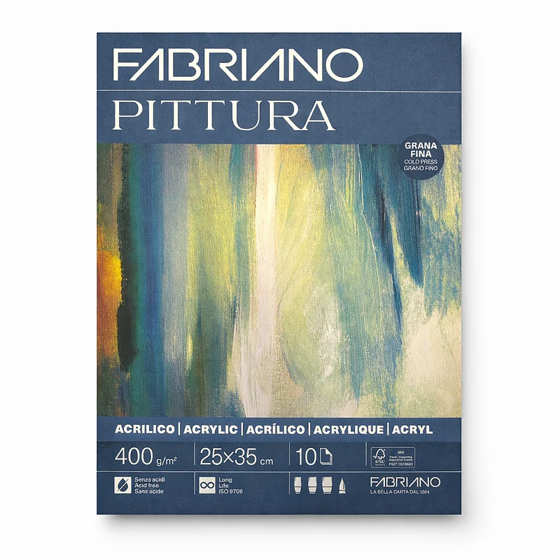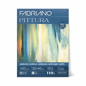 Fabriano Pittura es un papel texturizado para bellas artes, fabricado en máquina plana, ideal para acrílico y recomendado para óleo y témpera. Hecho con celulosa de alta calidad, es blanco y libre de ácido, lo que garantiza su durabilidad a largo plazo. Con un gramaje de 400 g/m², está disponible en los siguientes formatos: