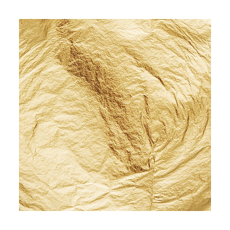 Hoja imitación oro, elaborada con una aleación de cobre y zinc, prensada entre dos capas de cuero para un acabado fino y manejable.