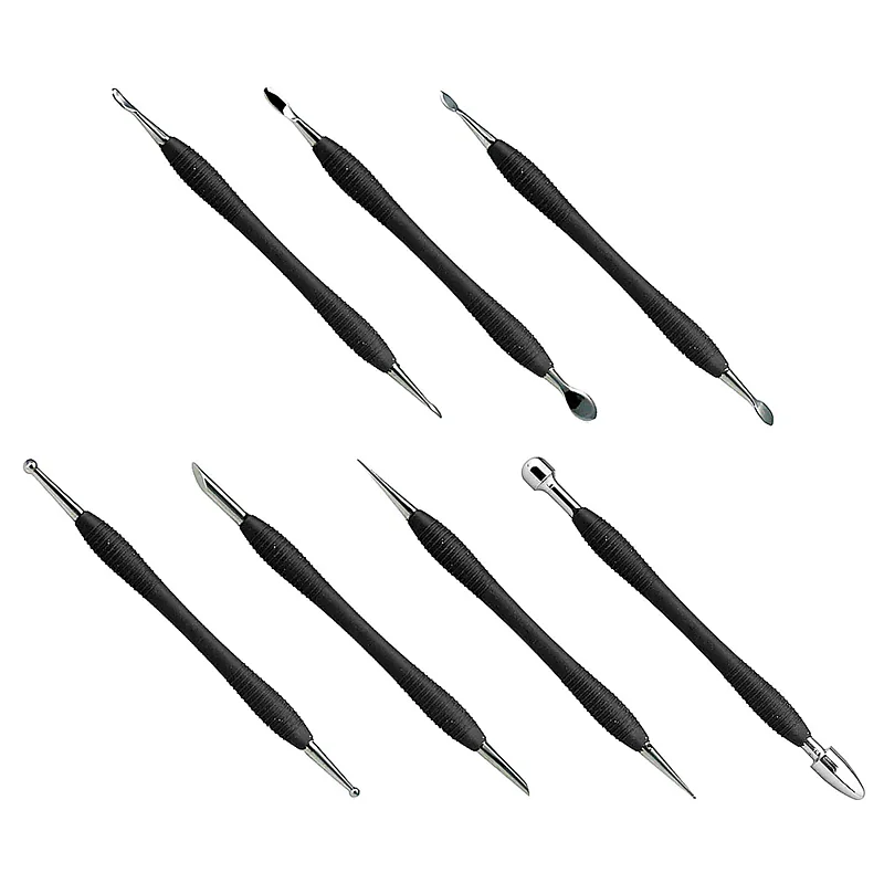 Herramienta de modelado de doble punta con dos terminales de estilo diferente, diseñada para ofrecer mayor control y comodidad durante el uso. Es una herramienta esencial para el tallado y modelado del cuero, equipada con un mango ergonómico de goma negra que reduce la fatiga de la mano. Gracias a su versatilidad, también puede utilizarse con arcilla, plastilina, pasta polimérica y otros materiales modelables.