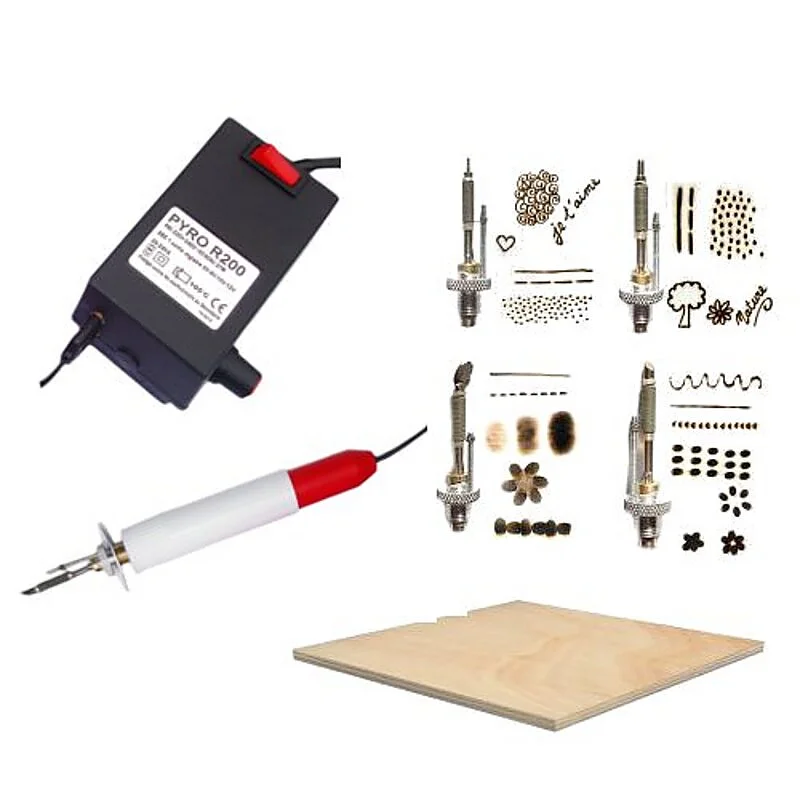 Este kit es ideal para aquellos que quieren entrar en el mundo de pirograbado con un pirografo profesional y precisa. El kit incluye: b> - Pirografo Profesional R200 con ajuste eléctrico (Cod. 26809), con una sola pieza de mano y la punta universal nº 21 - 4 puntas pirograbado (B21, B22, P20, O20) - Hojas para pruebas contrachapado
