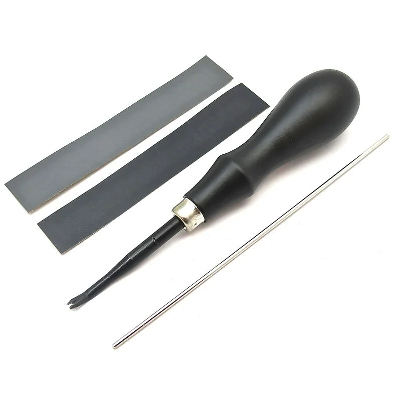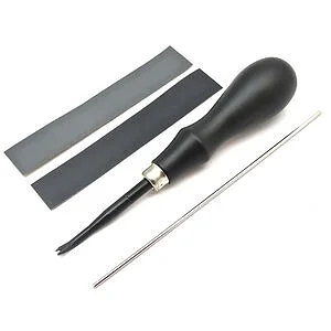 Matacantos profesional, fabricados en Japón. Practicar un corte plato para acabar los bordes de la piel. La cuchilla está curvada para asegurar la ergonomía durante el corte y es de acero tratado anti-herrumbre, la duración durante los años garantizados. Equipado con barra de metal y papel de lija para el lijado y pulido. Versión # 1 - 0,8 mm de grosor de cuchilla para cuero de hasta 1,3 mm. Versión # 2 - 1.0 mm de grosor de cuchilla para cuero de hasta 2,0 mm. Versión # 3 - 1.2 mm de grosor de cuchilla para cuero de hasta 3,0 mm. Versión # 4 - 1.2 mm de grosor de cuchilla para cuero sobre 3,0 mm.