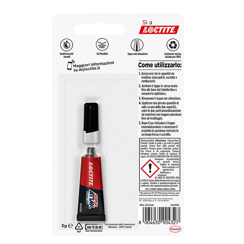 Adhesivo instantáneo en gel. Su fórmula reforzada con micropartículas de caucho lo convierte en un adhesivo adecuado para todas las superficies y específicamente para materiales flexibles como el caucho, el cuero y la piel. Resistente al agua, permite pegar materiales porosos como la madera y el corcho. Ideal para aplicaciones en superficies verticales. Formato: 3 g.
