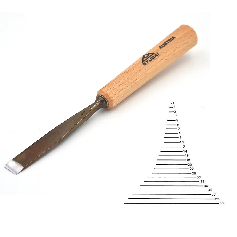 La casa austriaca STUBAI è produttrice di utensili per la scultura del legno realizzati con acciaio 58-60 HRC, di grande qualità e durata. Le sgorbie sono fornite con una lama già affilata e pronta all'uso, non lucidate. La lunghezza della lama varia a seconda del tagliente, più largo sarà il tagliente e più lunga sarà la lama.