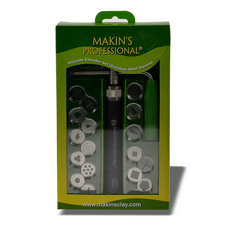 Le Makin's Professional Ultimate clay extruder combine la nouvelle génération du Makin's extracteur de type tournevis breveté, 20 disques de forme très appréciée et 2 bagues O supplémentaires dans une boite pratiuque et sure. Le nouvel extracteur de classe commerciale en acier inoxydable comprende une poignée en L qui peut etre ajustée pour optimiser le confort de l'utilisateur et ses traits internes peuvent accomoder les plus hauts couples requis. Les disques inclus sont un assortiment de formes fréquemment utilisées par des artistes pour créer un assortiment géométrique esthétique et des armatures complexes. La boite, solide, comporte un compartiment facilment accessible pour ranger l'extracteur, les dix séparateurs qui permettent aux accessoires de rester rangés dans leurs compartiments individuels, un couvercle transparent et un double mécanisme de fermeture. Les extrudeuses Makin's ont été agrées pour l'utilisation avec l'argile polymère, la décoration de gateaux et dans d'autres industries partout dans le monde car elles sont résistantes et ont été conçues pour se preter aux nombreux usages des professionnels utilisant plusieurs types d'outils modelant. Pour obtenir les meilleurs résultats, traitez minutieusement les outils modelant jusqu'à obtenition d'une consistance malléable.