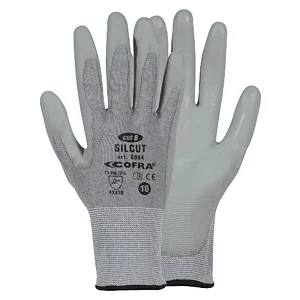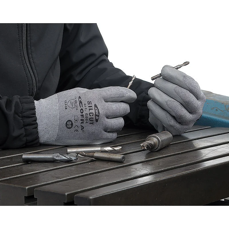 Gants en fil de nylon gris avec doublure interne Nextofil, paume et bout des doigts enduits de polyuréthane, dos et poignet élastiques.