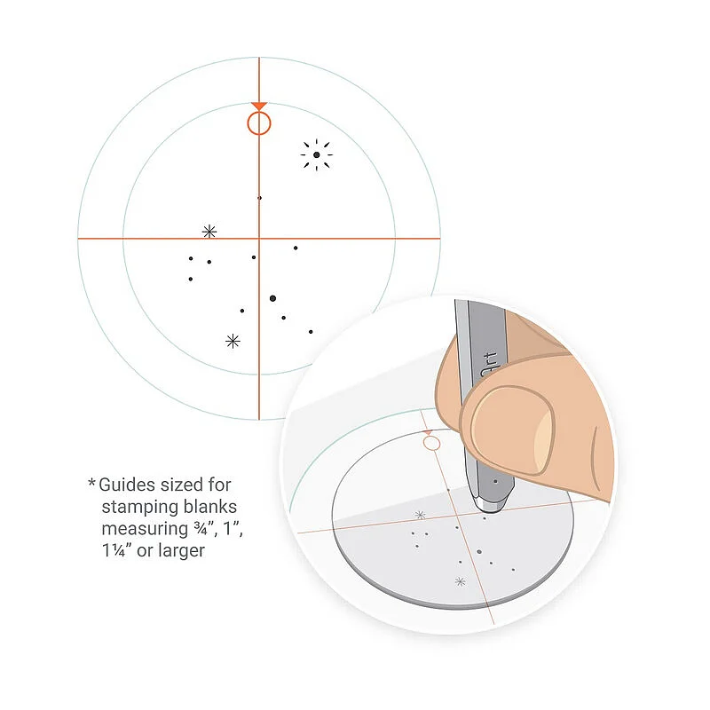Questo kit permette di creare meravigliosi gioielli con le costellazioni. Per aggiungere delle note di colore, potete usare il nostro kit per fissaggio pietre. Il kit include delle guide per diametri 19 - 25 e 30 mm. Gli stampi inclusi sono adatti alla stampa di materiali come alluminio, ottone, rame, oro, argento e altri metalli dolci.