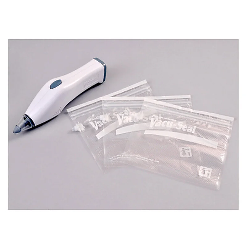 Pompa del vuoto da utilizzare con i sacchetti cod. 17151. Cordless, funziona con 6 batterie stilo AA. Inclusi nella confezione 3 sacchetti.