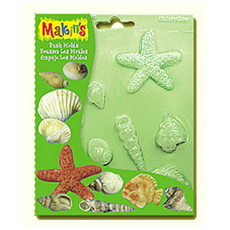 8 conchiglie, 1 pesciolino e 1 stella marina di dimensioni da 1 x 2 cm (la conchiglia più piccola a 5 cm. la conchiglia più lunga e la stella marina. Questo stampo non può essere utilizzato per materiali commestibili.