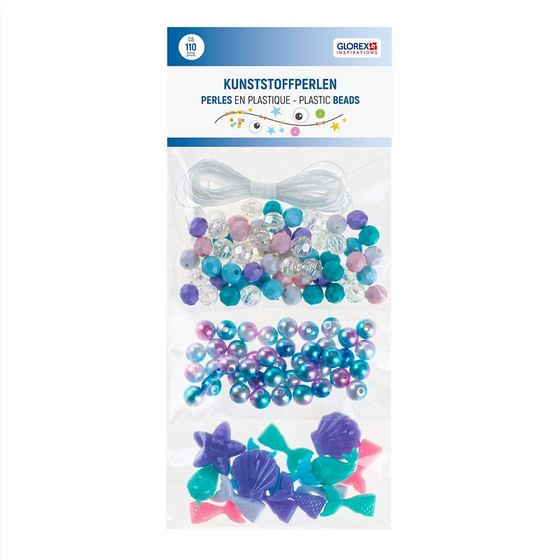 Perles en plastique thème sirène, 110 pièces assorties avec élastique de 3 m. Les perles colorées et coordonnées sont idéales pour la création de bijoux ou d’autres loisirs créatifs. Le set comprend des perles et un cordon élastique, parfaits pour réaliser bracelets, colliers et accessoires personnalisés. Couleurs harmonisées “Nixe”.