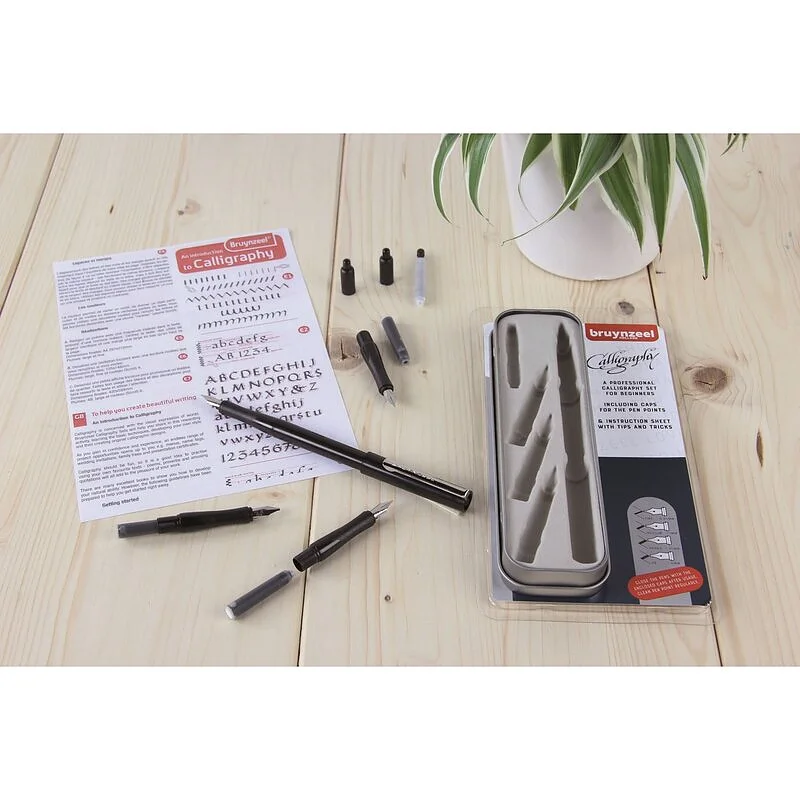 Set professionnel de calligraphie pour débutants. Comprenant quatre pointes en laiton différentes (médium, fine, large et 2B), un convertisseur et 3 cartouches d’encre noire. Instructions, conseils et astuces fournis.