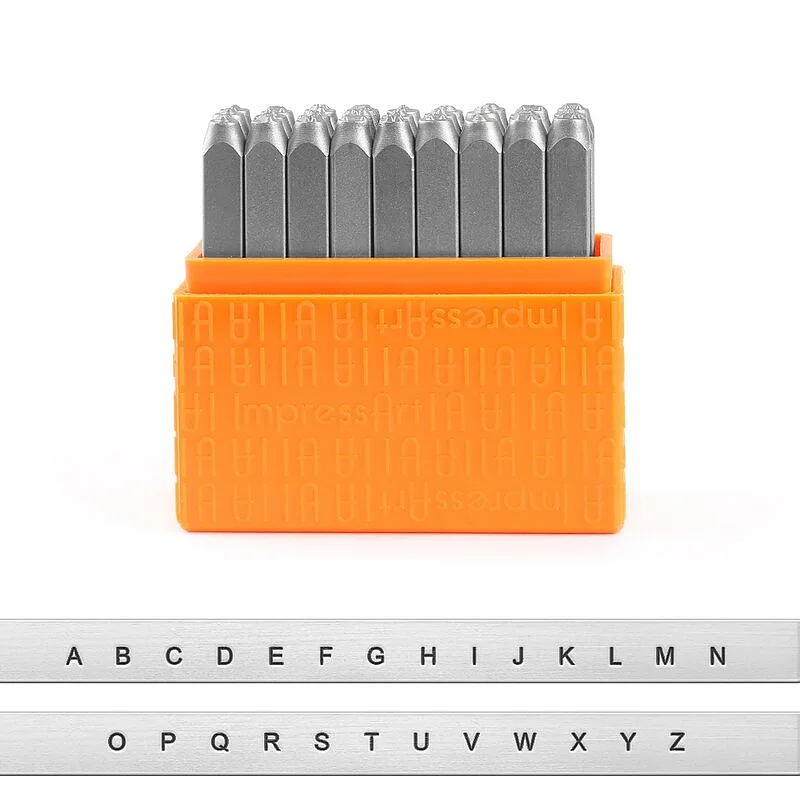 Il comprend alphabet de A à Z .. Pour imprimer des métaux tendres tels que le laiton, le cuivre, le nickel, l'or, l'argent et l'aluminium. Ils peuvent également être utilisés sur des argiles et sur le cuir.
