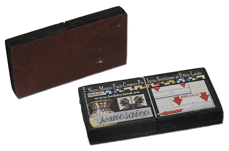 Break-it micromosaico. Questo attrezzino è molto utile per tagliare nel modo più facile i pezzi di micromosaico seguendo la pre-incisione. Basta appoggiare la placca con la parte smaltata verso il basso e far pressione. Sul retro e' rivestito di carta vetrata con due tipi di grana.