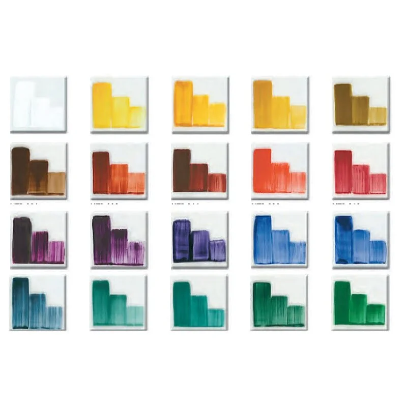 I colori in polvere per Terzo Fuoco serie HTP devono essere miscelati con i nostri medium in funzione delle necessità o delle proprie conoscenze tecniche. Questa serie si caratterizza per la presenza di piombo, il che rende i colori veramente brillanti già a partire dalle temperature più basse. La gamma di 42 colori è indicata per un uso compreso tra 720°C e 820°C (cono Orton SSB 018-015) in relazione alla durezza del supporto sottostante. Tutti i colori possono essere miscelati tra loro.