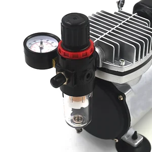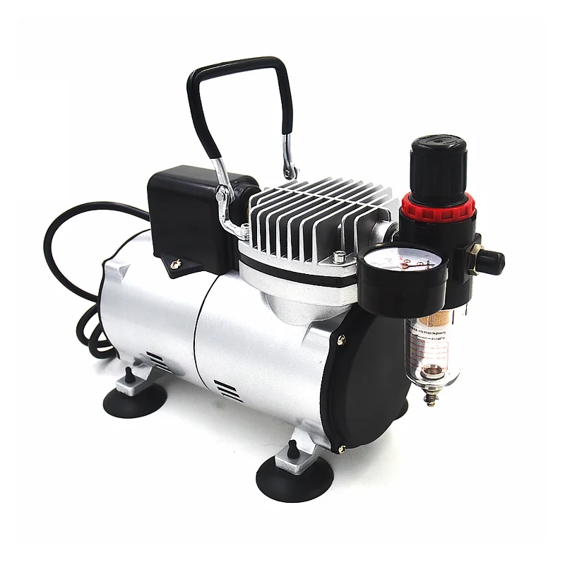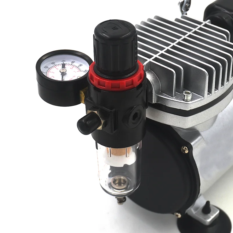 Questo compressore silenziato per aerografo è portatile e leggero, ed è la soluzione ideale per modellisti, artisti, decoratori di torte e altro. Senza olio e senza manutenzione: l flusso d'aria costante e regolabile che garantisce una lavorazione continuativa senza sbalzi. Ottimo per l'uso con un'aeropenna. Attacchi standard 1/8 per tubo ad aria, filtro anticondensa e regolatore di pressione. Questo modello è termicamente protetto e dotato di ventola di raffreddamento. La funzione di aria è on-demand: significa che una volta che ha raggiunta la sua pressione d'uscita si spegne automaticamente. Riparte solo quando l'aerografo è in funzione e la pressione scende.