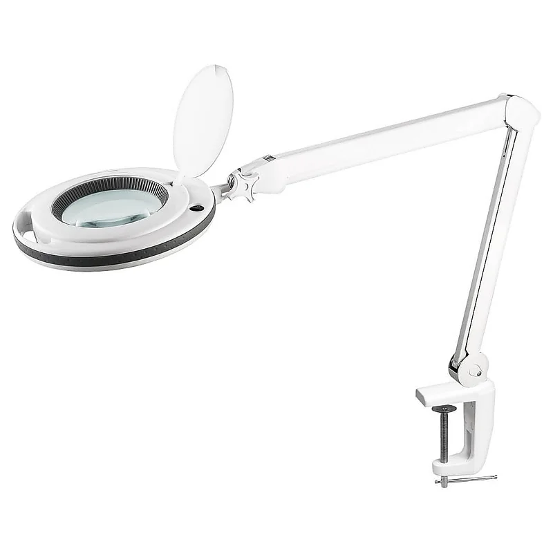 Lampada Dimmerabile con Lente d'Ingrandimento - Ideale per cosmetologi, gioiellieri, orologiai, estetisti e artigiani. Dotata di morsetto da tavolo, braccio articolato regolabile e lente da 5 diottrie con copertura protettiva. Illuminazione a LED con 60 lampadine, basso consumo energetico (850 lumen). Alimentazione con spina italiana.
