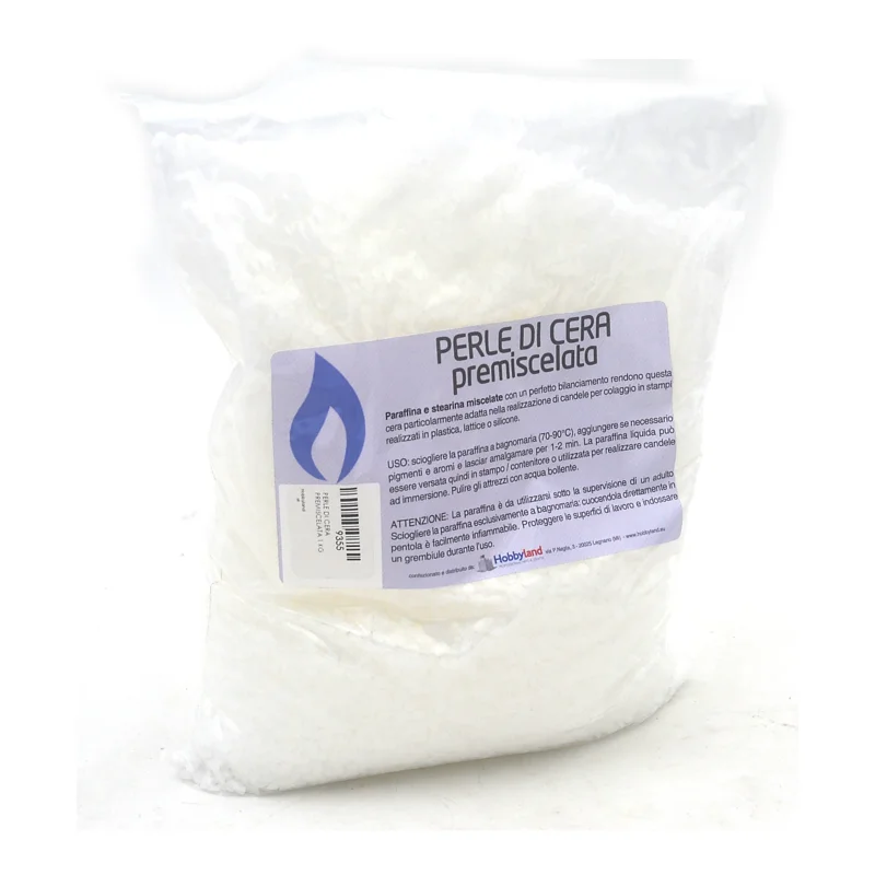 Paraffina e stearina miscelate con un perfetto bilanciamento rendono questa cera particolarmente adatta per la realizzazione di candele autoprodotte (mediante l'utilizzo di stampi) o candele in contenitore.