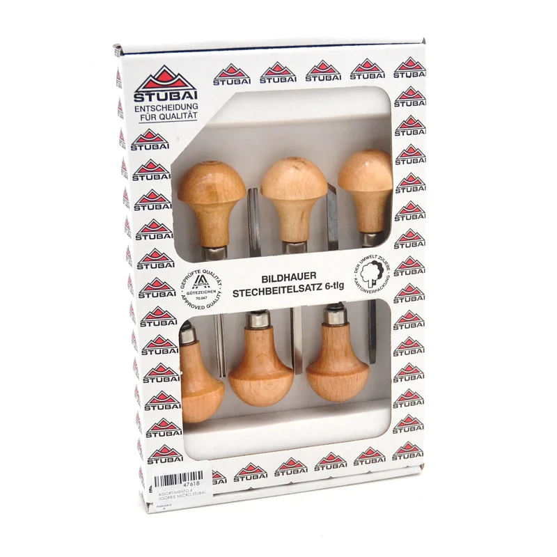 Set 6 Sgorbie da scultura Micro Stubai, Made in Austria. Questo assortimento è particolarmente indicato per chi vuole iniziare l'arte della scultura del legno o Linoleografia con degli strumenti di precisione e grande qualità e durata garantita nel tempo. Gli utensili sono già affilati e pronti all'uso.