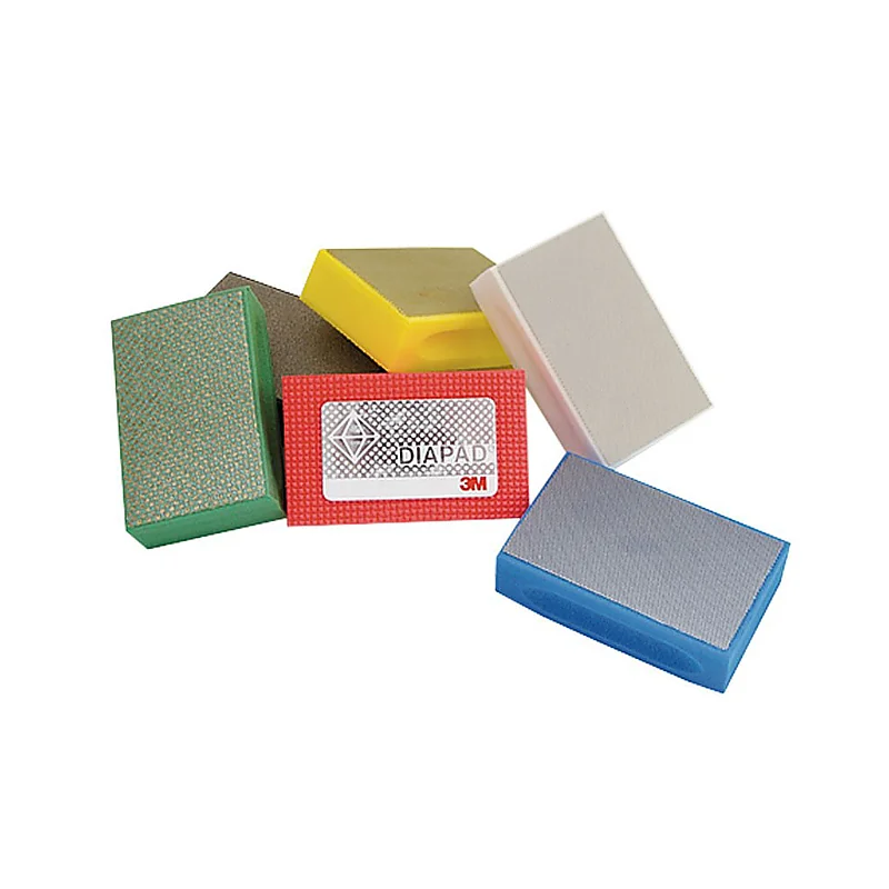 Tamponi diamantati 3M, con trama a puntini, ideali per sgrossature e rifiniture manuali su superfici di vetro, ma anche marmo, ceramica o altri materiali. Lo spessore di spugna permette all'utilizzatore di avere un'ottima presa durante la lavorazione.